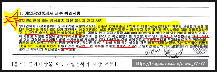 확인설명서 "10 실제 권리관계 또는 공시되지 않은 물건의 권리사항" 란에