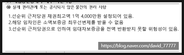 임차인의 임대차 보증금과 체남 세액을 알 수 없으므로 추후 경매 진행 시 임대차보증금을