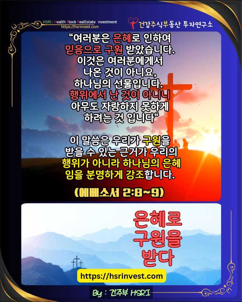 "여러분은 은혜로 인하여 믿음으로 구원받았습니다. 이것은 여러분에게서 나온 것이 아니요, 하나님의 선물입니다. 행위에서 난 것이 아니니 아무도 자랑하지 못하게 하려는 것입니다.(에베소서 2 : 8~9)"