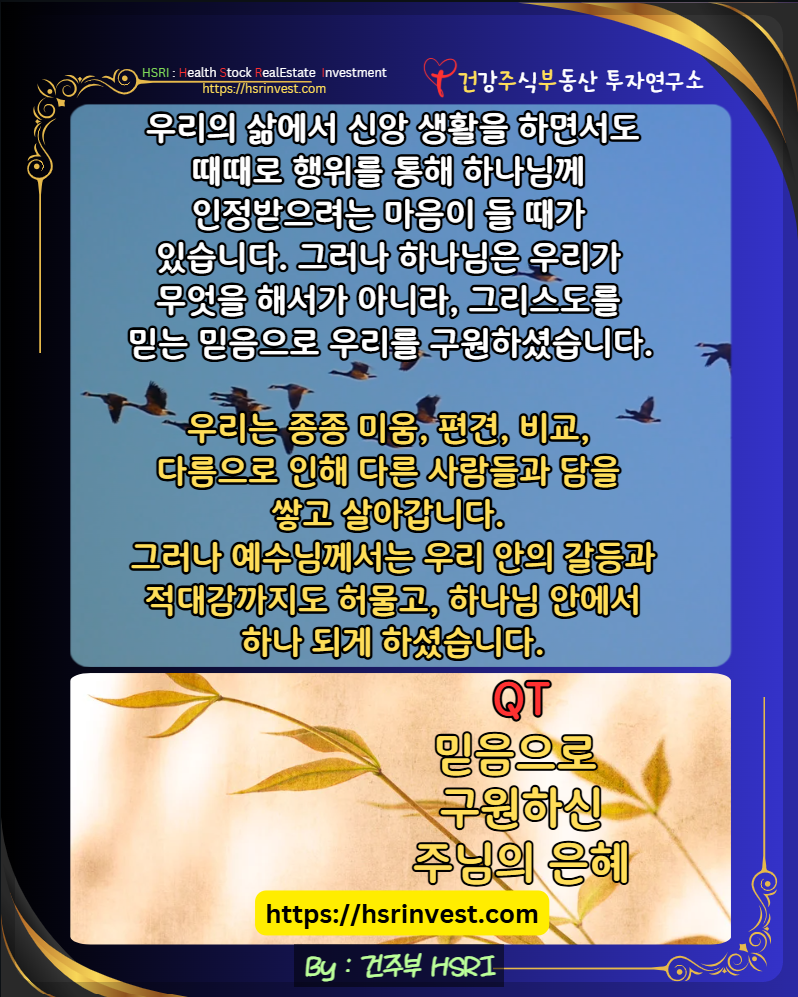 우리의 삶에서 신앙 생활을 하면서도 때때로 행위를 통해 하나님께 인정받으려는 마음이 들 때가 있습니다. 그러나 하나님은 우리가 무엇을 해서가 아니라, 그리스도를 믿는 믿음으로 우리를 구원하셨습니다. 이것을 기억하며 오늘도 겸손하게 하나님께 감사하며 살아가야 합니다.