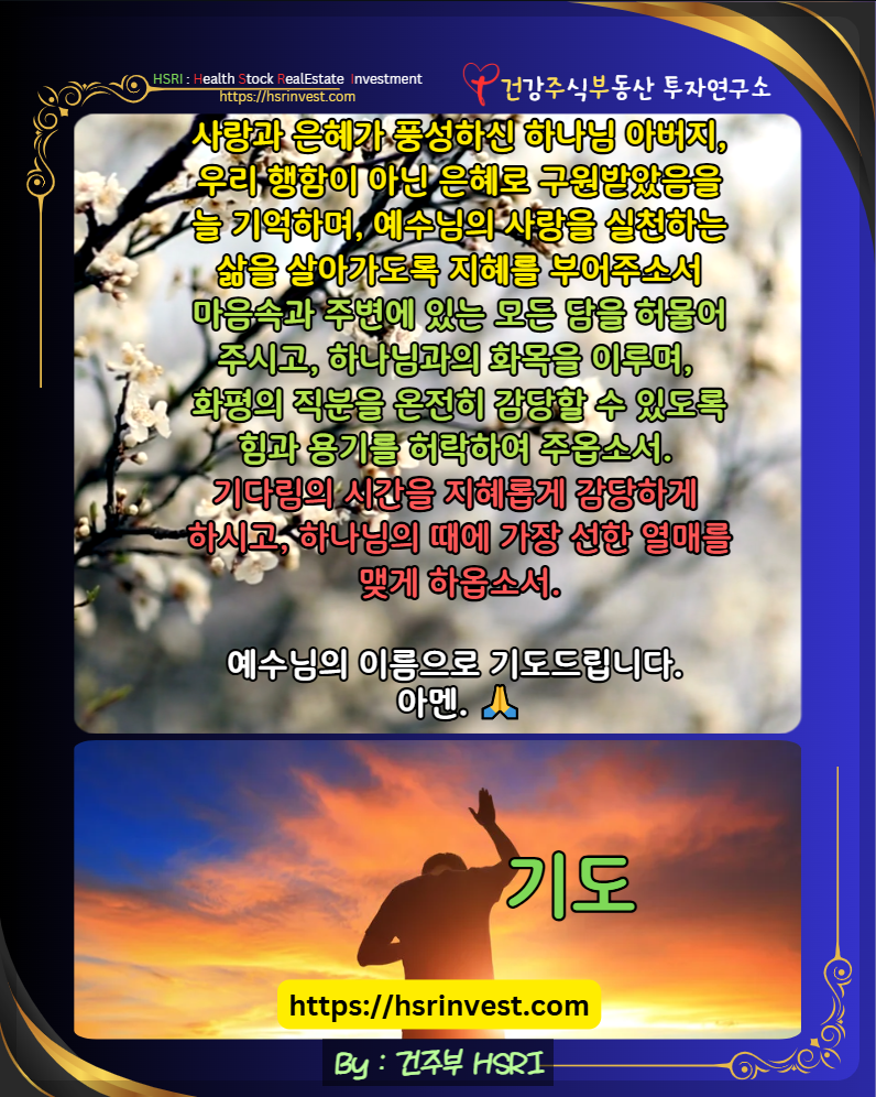 "사랑과 은혜가 충만하신 하나님 아버지, 건주부님을 하나님의 선한 도구로 세우시고, 주님의 사명을 감당할 수 있도록 인도하심에 감사드립니다.
