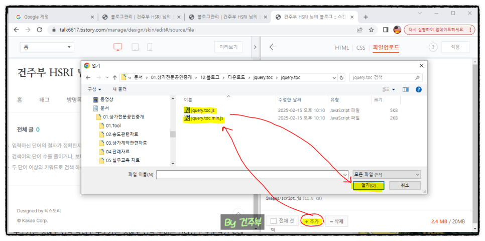 해당 2개의 파일을 다운로드한 뒤 티스토리 관리 화면에서 파일을 업로드해 줘야 합니다.
