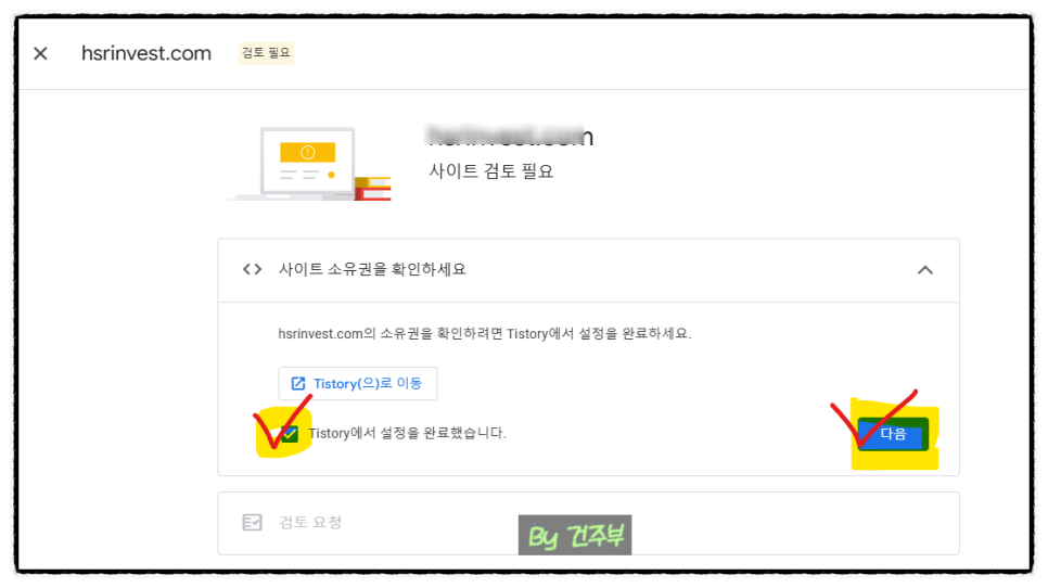 3."Tistory에서 설정을 완료했습니다."에 체크를 하고 "다음"을 클릭합니다.
