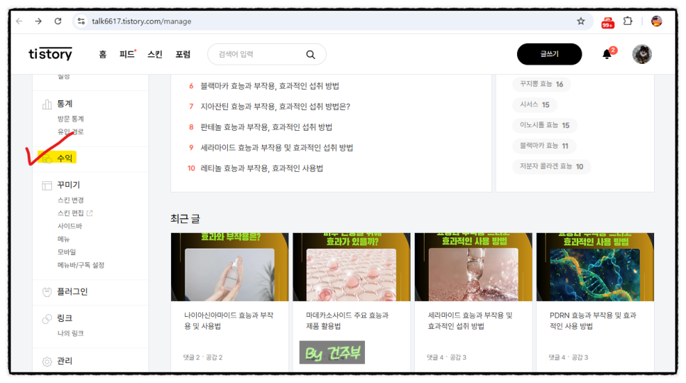 1.Tistory 블로그 관리 메뉴에서 "수익" 클릭하기