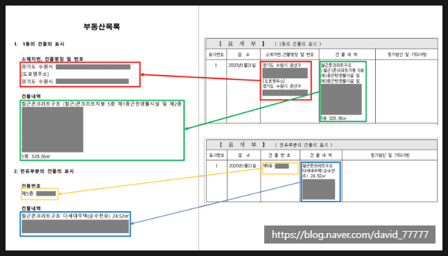 - 부동산 목록은 등기부 등본의 표제부(1동의 건물의 표시 와 전유부분의 건물의 표시)를 보고 동일하게 기록합니다.