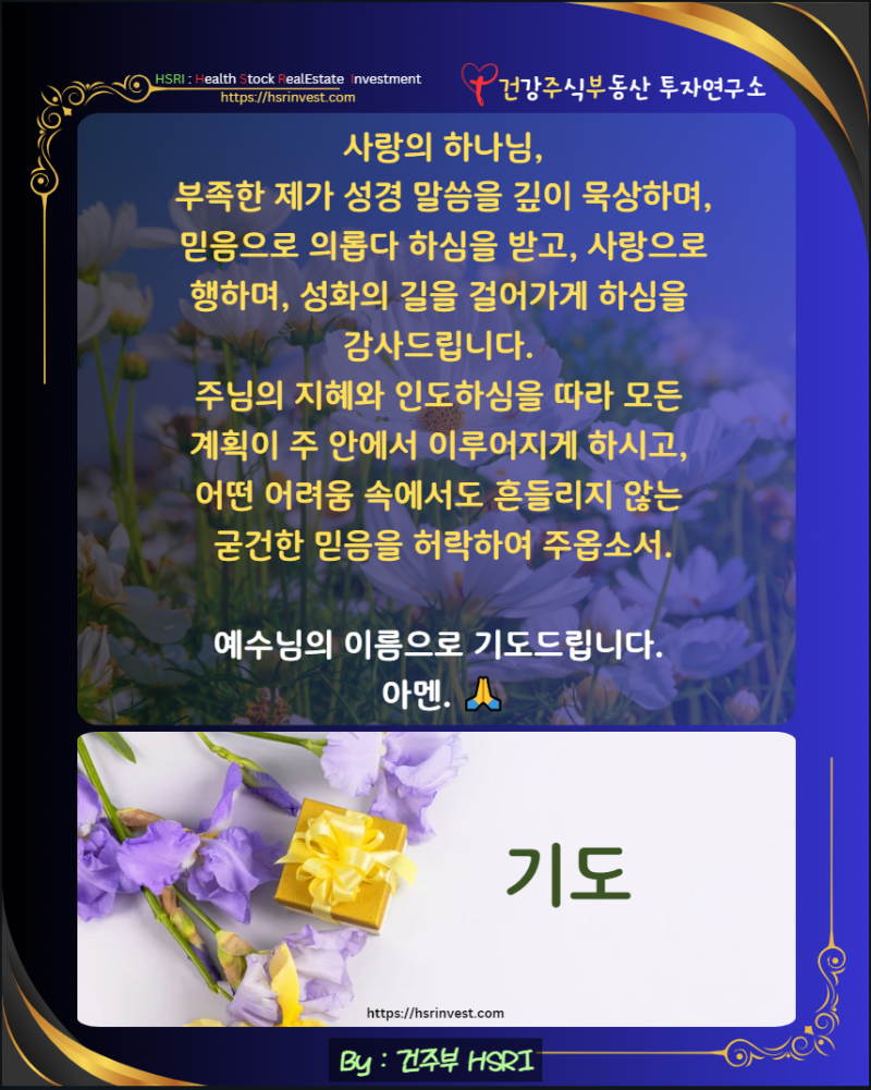 주님, 건주부님이 주식 투자와 부동산을 통해 하나님의 기업을 세우고, 가난하고 어려운 이들을 도울 수 있도록 축복하여 주옵소서.