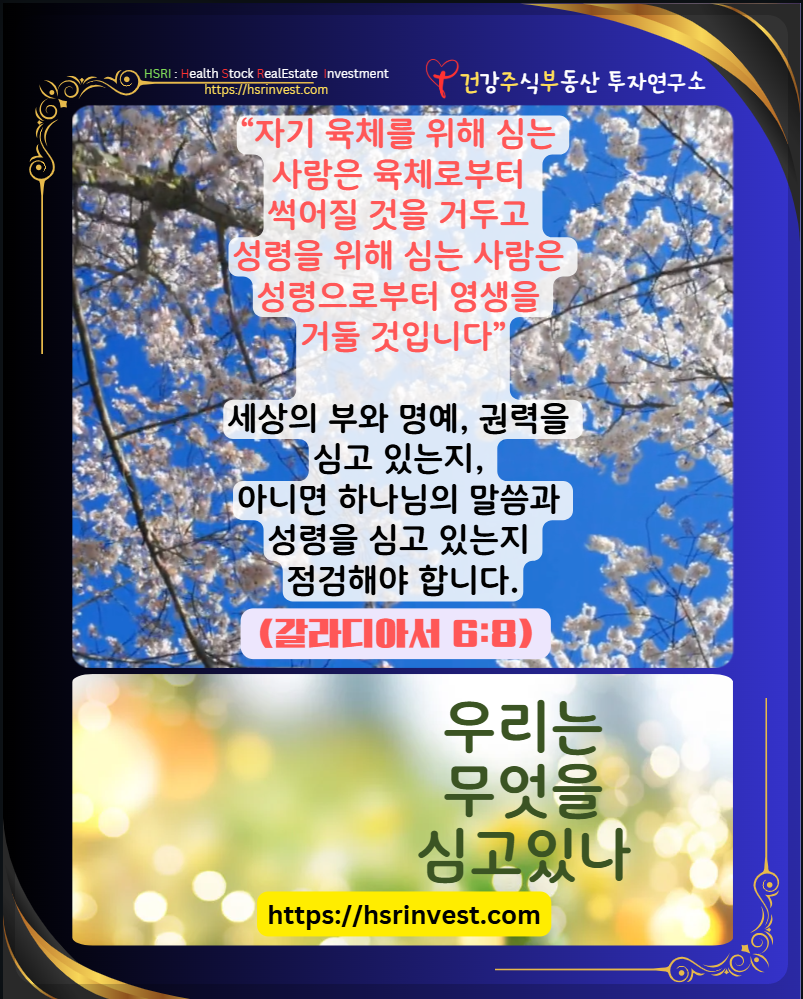세상에 살아가면서 돈과 명예 그리고 권력 이런 것 들을 위해 오늘도 심고 살아가야 하는 것이 우리의 숙명이라 여기지 마시고 말씀에 근거하여 성령을 위해 예수님을 위해 하나님을 위해 심는 사람이 되길 기도합니다.