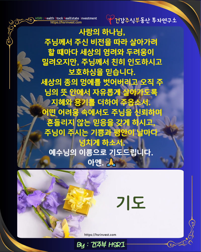 또한, 건주부님이 하는 모든 일이 주님의 영광을 위한 통로가 되게 하시고, 그 삶을 통해 많은 사람들이 주님의 사랑을 경험할 수 있도록 축복하여 주옵소서.