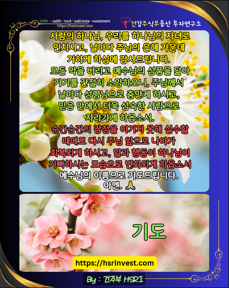 오늘도 성령님과 동행하며, 하나님이 기뻐하시는 말과 행동을 실천하는 하루가 되기를 결단하는 건주부님을 기억하여 주시고, 주님의 뜻을 이루어가는 삶이 되게 하옵소서.