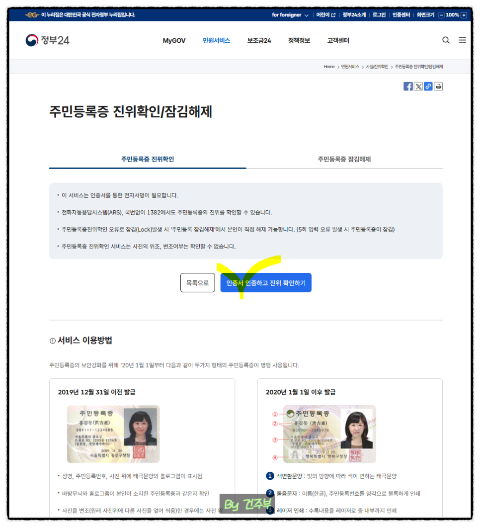 정부24/민원서비스/주민등록증 진위확인/인증서 인증하고 진위확인하기