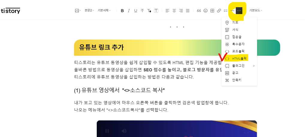 (2) 티스토리 글 작성 페이지에서 상단 "···" 점 세개 메뉴를 선택하고 "<> HTML블록"을 선택합니다.