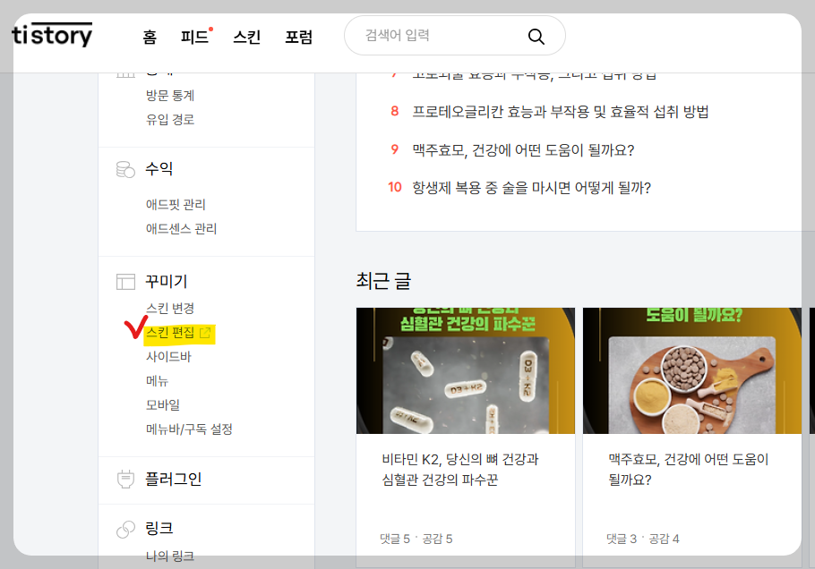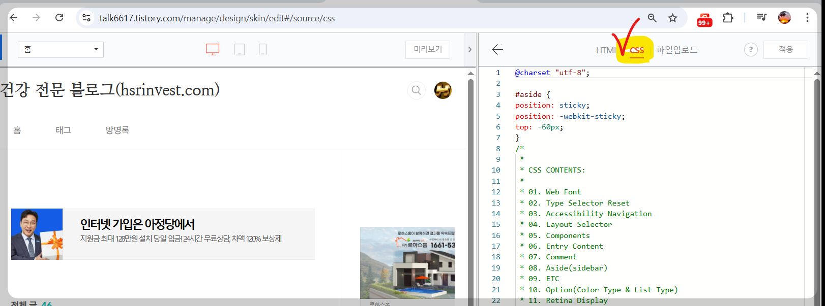 참고로 변경될 CSS코드는 블로그 마지막체 첨부해두었습니다.