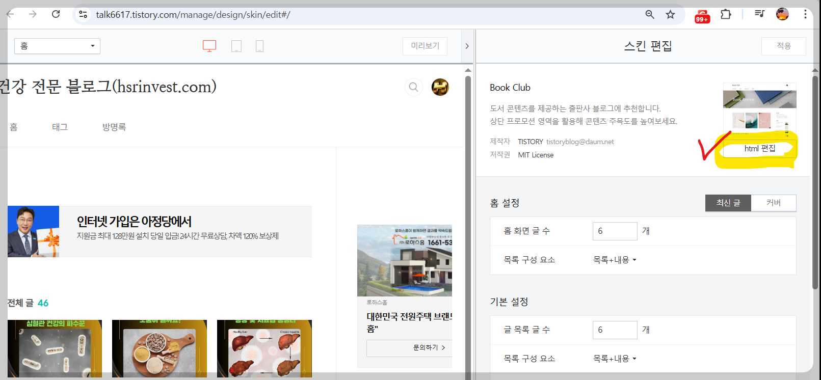 2. 오른쪽 "html편집"버튼을 클릭합니다.