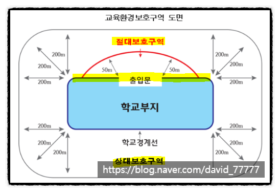 - 절대 보호구역: 학교 출입문으로부터 직선거리로 50미터까지인 지역(학교 설립 예정지의 경우 학교 경계로부터 직선거리 50미터까지인 지역), 유해 업종의 설치가 절대 금지되는 구역.