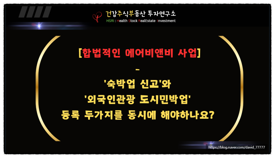 에어비앤비 공유 숙박업을 합법적으로 하기 위해서는 숙박업 신고, 외국인 관광 등록이 필요합니다.