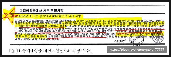 "확인설명서 9번 실제 권리관계 또는 공시되지 않은 물건의 권리 사항"란에