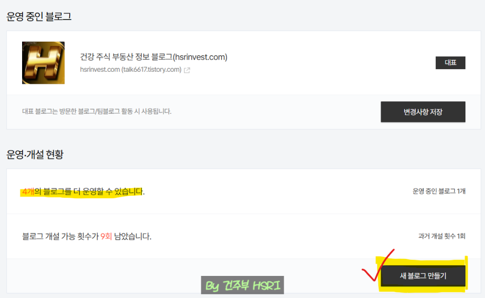 2. 중간 블록의 "운영·개설 현황"에 "새 블로그 만들기"를 클릭합니다.