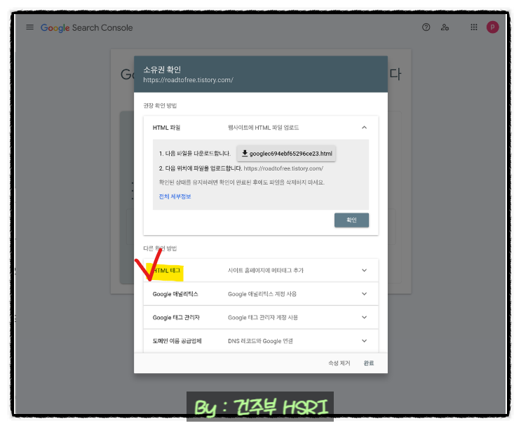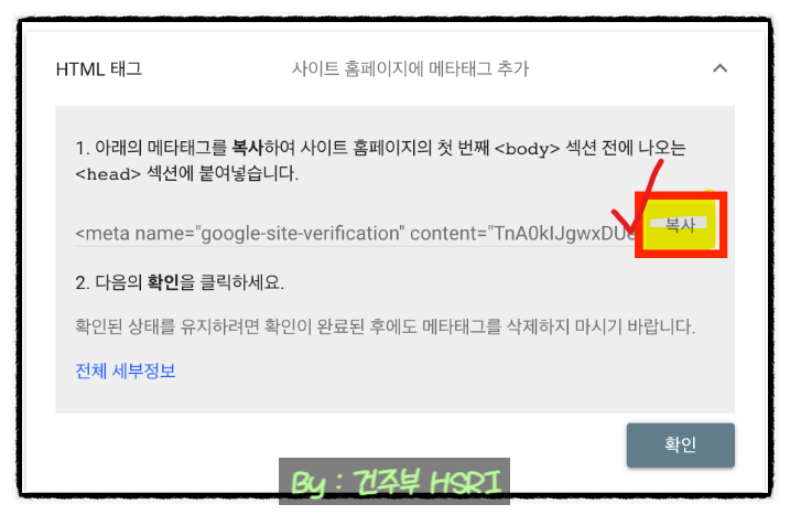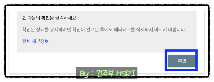◆ 구글 서치 콘솔로 되돌아와 확인 버튼을 클릭합니다.