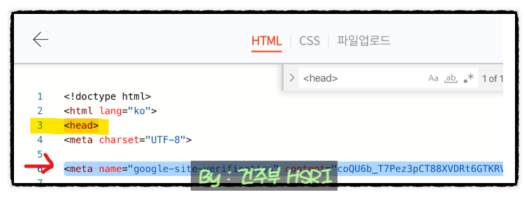 ◆ 본인의 티스토리 관리자 페이지 > 스킨 편집 > html 편집 > HTML 탭으로 이동하여 <HTML> 아래에 조금 전 복사한 코드를 붙여 넣기를 하고 적용을 클릭합니다.