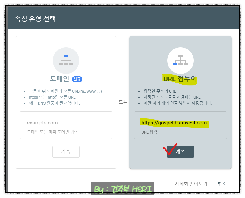 ◆ 도메인 주소를 입력하고 계속을 클릭하면 새로운 창이 발생합니다