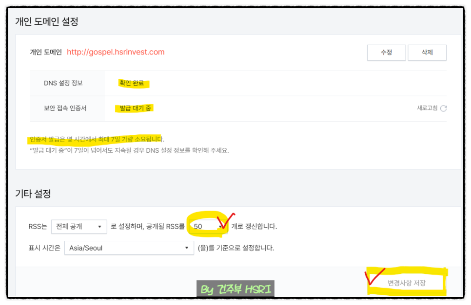변경사항 저장을 클릭하면 DNS설정 정보 "확인 완료" 와 보안 접속 인증서 " 발급 대기 중"을 확인합니다.