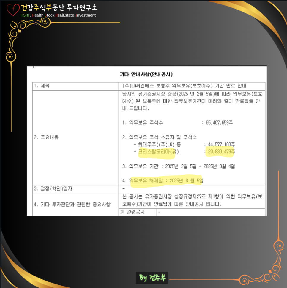 - 해제 물량: 약 21.5% (6,540만주 중 약 4,457만주 / 최대주주 맥쿼리 PE)