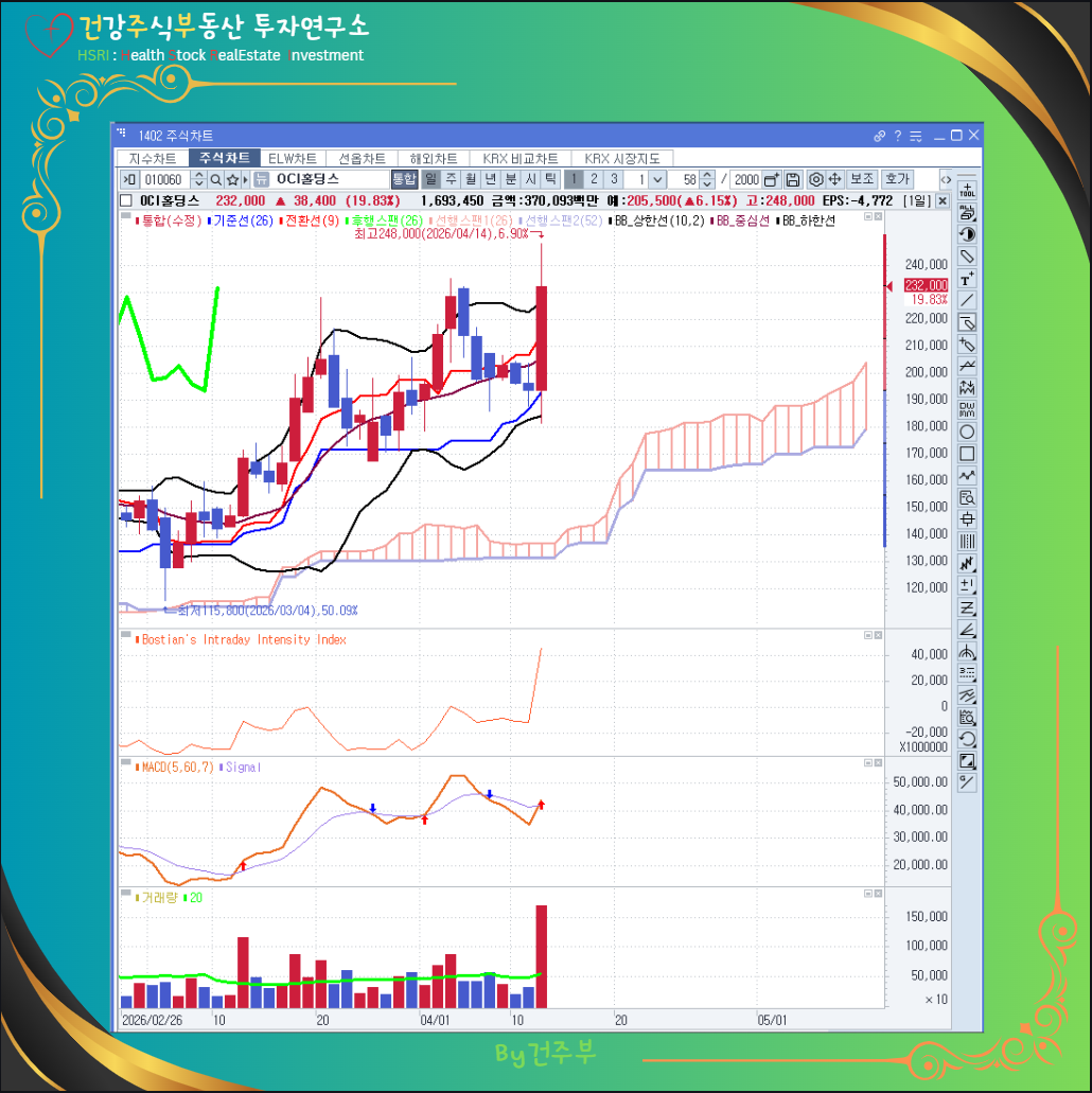 해당가격이 전고점 232,000원에 -22% 부근 잔고부족이 발생되는 가격까지 하락을 한것입니다. 아마도 외국인들은 관련내용을 사전에 알고 6일간 OCI홀딩스를 하방으로 작업을 했던 것으로 생각이듭니다.
